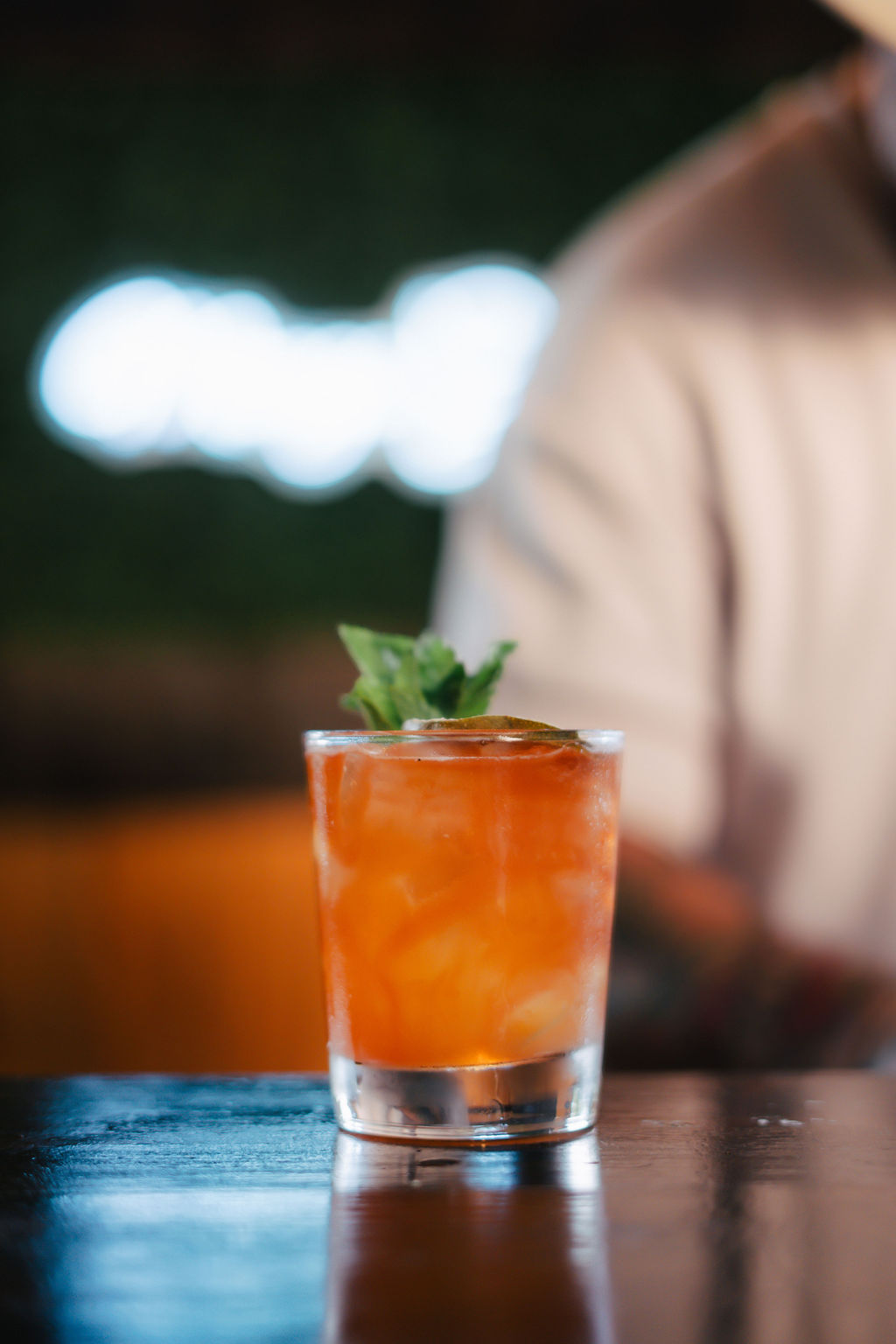 Build in a mixing glass, top with ice, and stir for dilution. Pour into double rocks glass and garnish with fpineapple prawns and fresh mint.