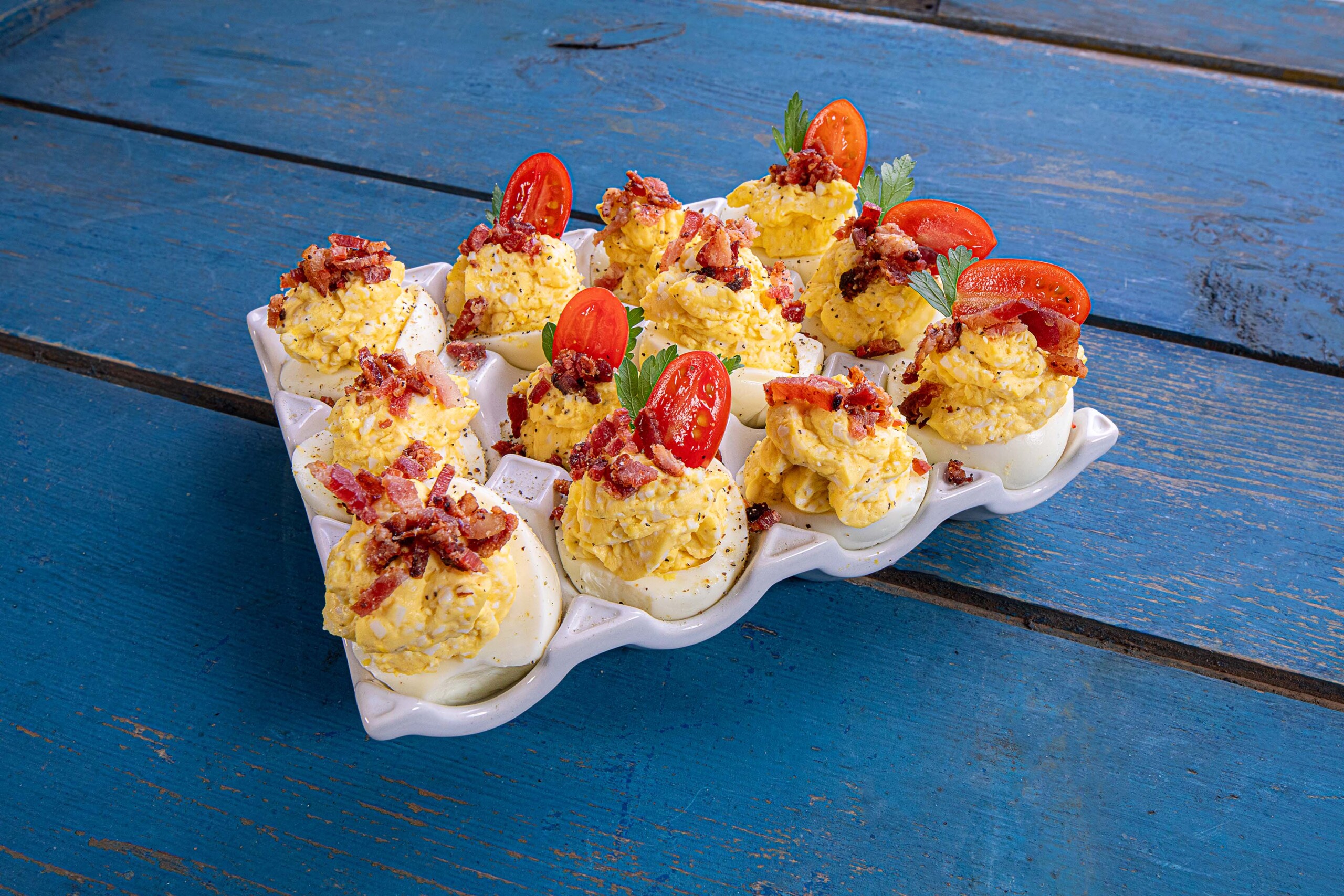 Completely peel the hard-boiled eggs, being careful to keep the shape. Using a clean knife each time, cut the peeled eggs in half (lengthwise). Carefully scoop the egg yolks into a small mixing bowl. Use a fork to break up and mash the yolks. Add the mayonnaise, mustard, hot sauce (if desired), lemon juice and seasoning blend to the yolks. Stir ingredients until smooth and fully combined. Use a spoon or piping bag to evenly fill each egg white half with the yolk mixture. Evenly top each deviled egg with an even amount of bacon bits. Garnish with Florida cherry tomato halves and sprigs of fresh parsley, if desired. Keep the deviled eggs cold and covered in the refrigerator until served.