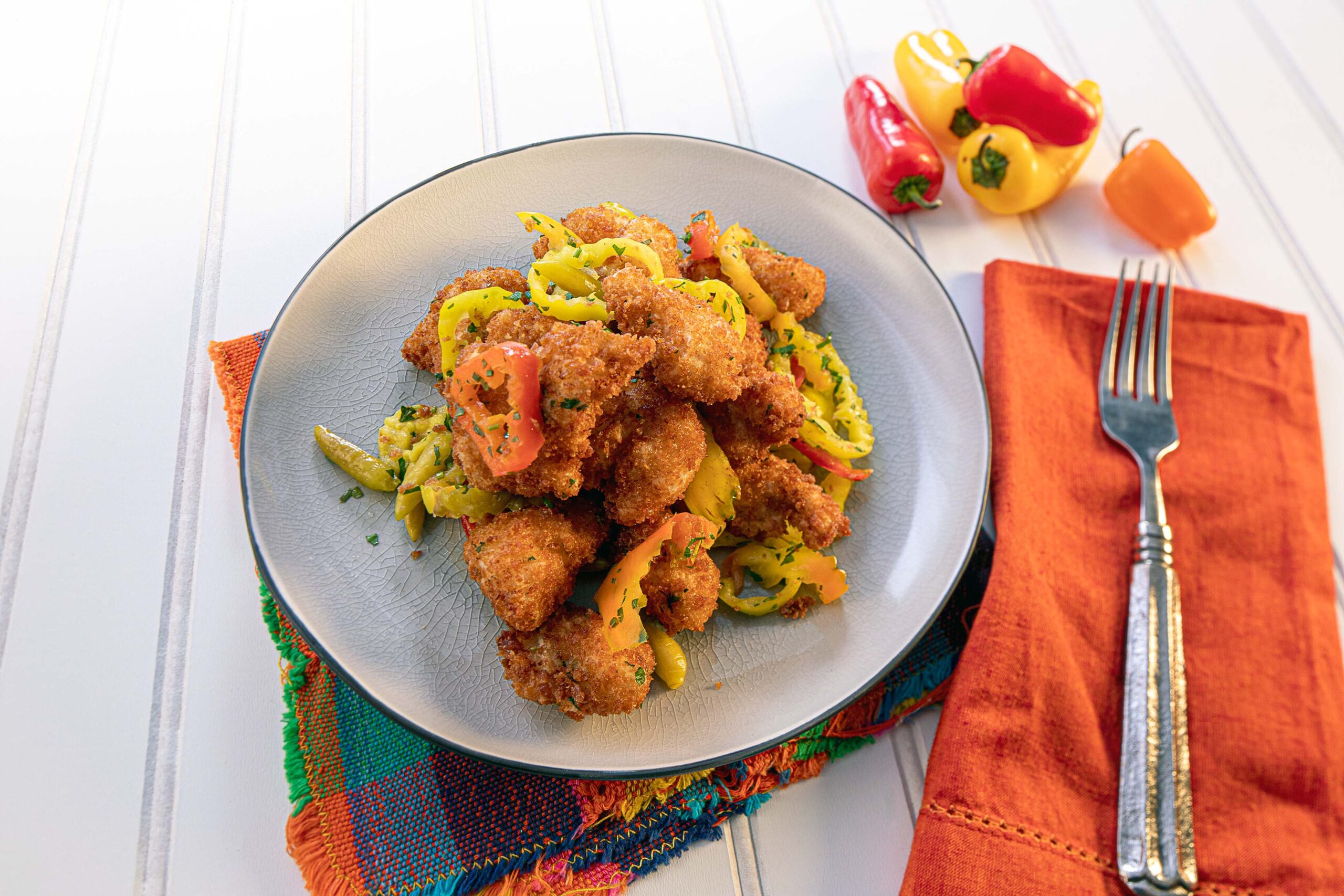 Depending on the size of your fryer, divide nuggets into batches. Coat first batch in egg mixture and let drain slightly. Next, dip wet nuggets into seasoned flour mixture; gently shake to remove any excess flour. Return nuggets to the egg mixture and coat; drain excess. Lastly, evenly cover wet nuggets in panko; gently shake to remove excess panko.
