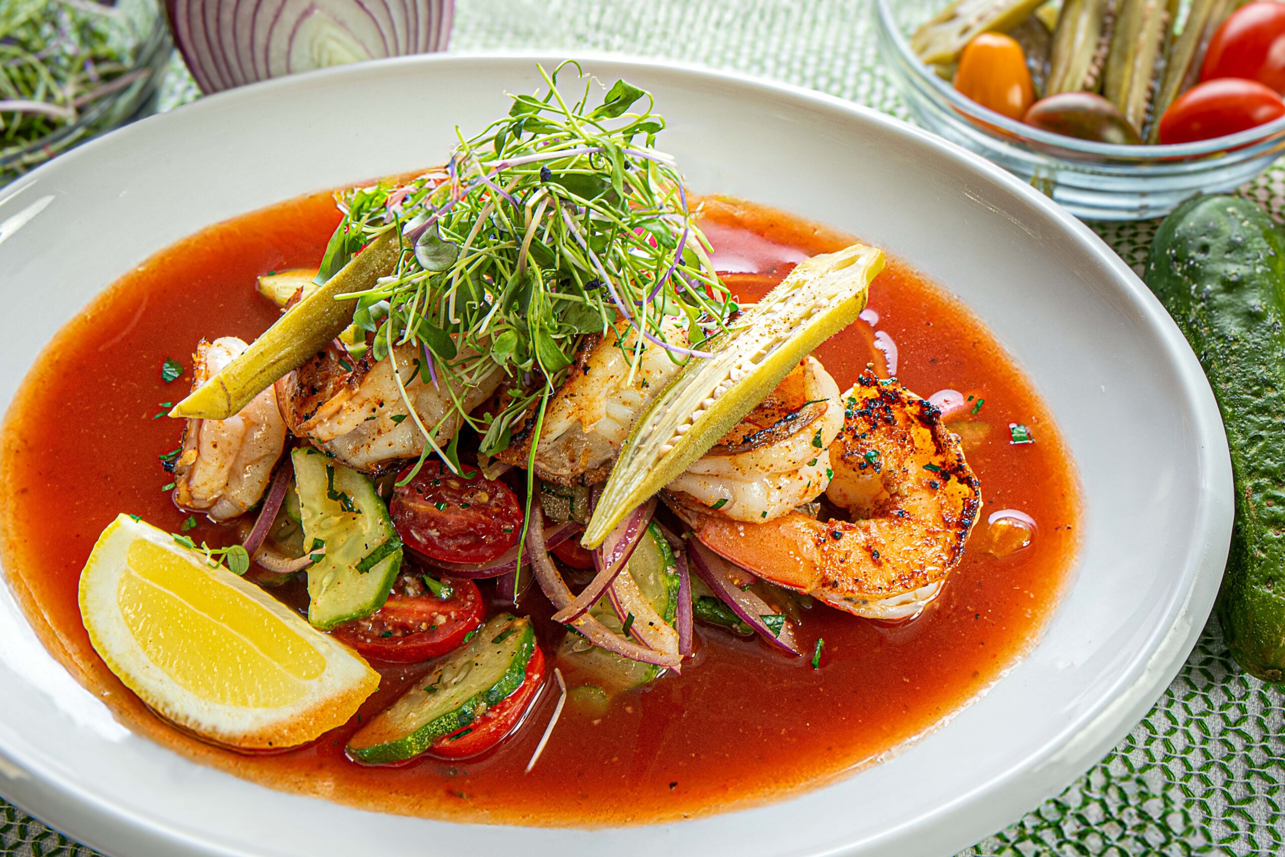 In a mixing bowl, combine the halved tomatoes, cucumber, celery, red onion, diced tomato, lemon juice, seafood seasoning blend, teaspoon horseradish, hot sauce, shrimp and okra. Stir ingredients lightly to coat. Adjust seasoning with hot sauce, sea salt and fresh ground pepper, to taste. Cover and keep chilled in refrigerator. To serve, toss ingredients and spoon out an even amount in each bowl. Pour an even amount of the chilled Bloody Mary mix (about ½ cup each) over the shrimp and vegetable mixture. Lightly shake a little celery salt on top and garnish with fresh greens and ¼ of a fresh lemon. Serve cold.