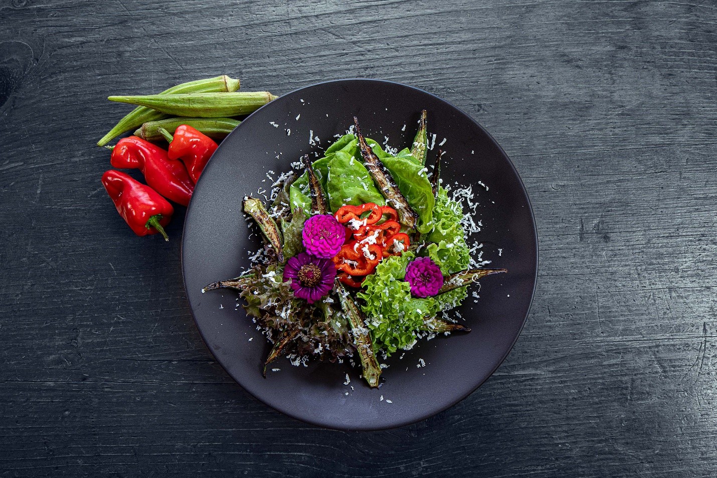 Prepare the salad in two chilled bowls, by carefully hand tearing and evenly arranging the Florida lettuce. Place even amounts of charred okra over the salad greens. Add the sliced sweet peppers and fresh grated Pecorino Romano cheese. Garnish each salad with the edible Florida flowers. Serve with Florida Hot Honey Vinaigrette.