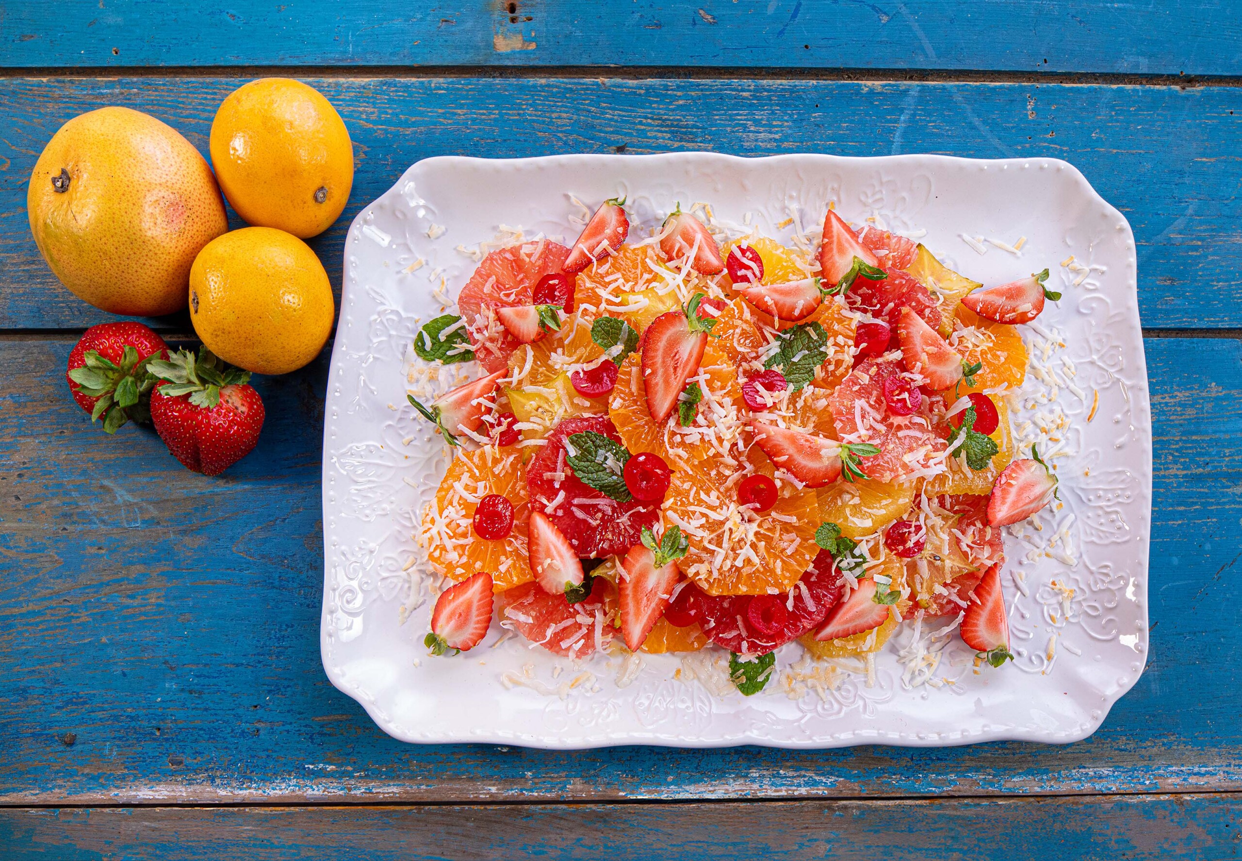 On a medium-sized platter, layer the citrus and starfruit creatively, as desired. Drizzle with Florida honey and sprinkle with toasted coconut. Add the Florida strawberries and maraschino cherries. Garnish with fresh mint sprigs and leaves. Serve chilled.