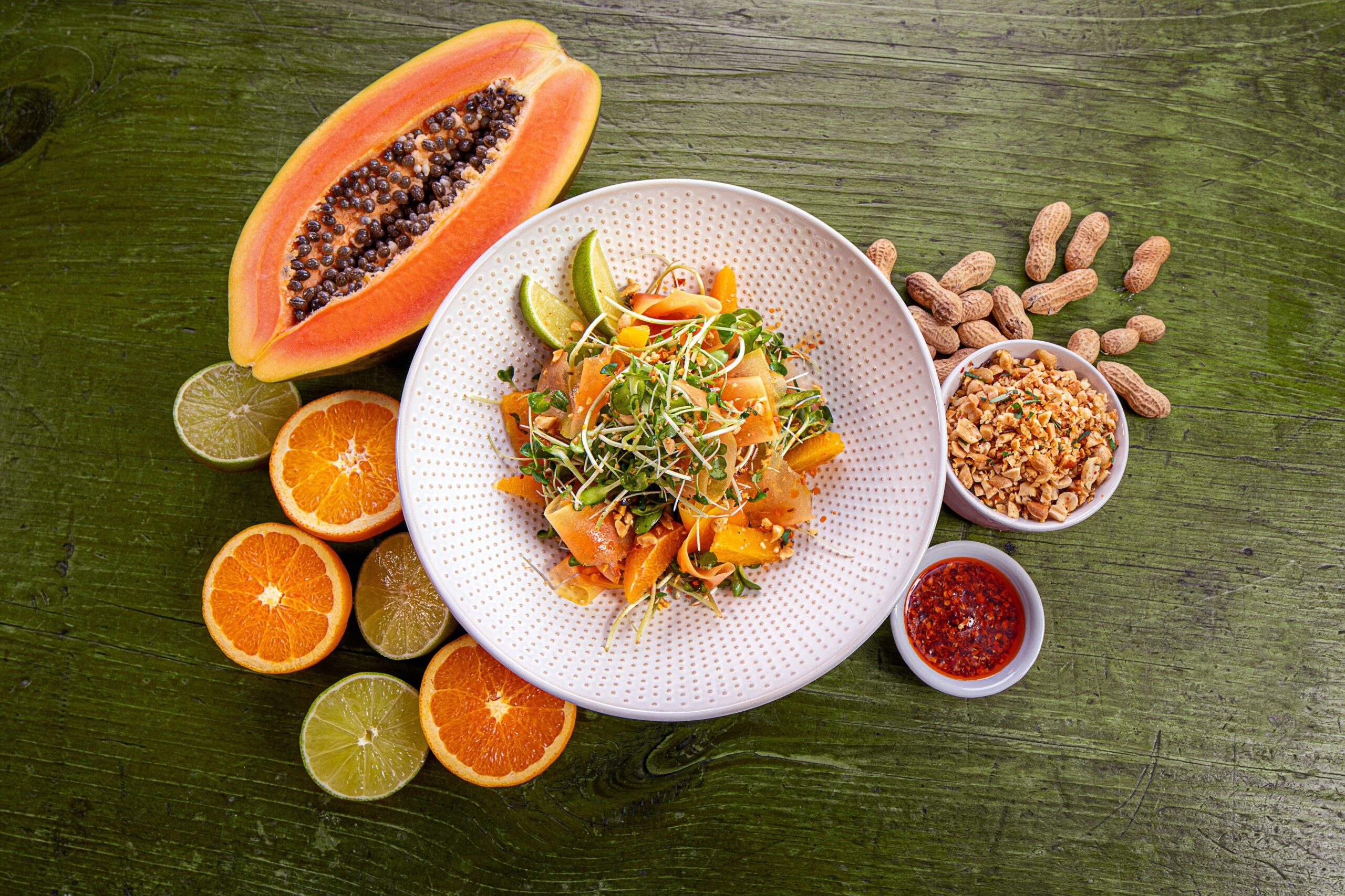 Drizzle the lime juice evenly over the salad followed by a light drizzle of crunchy chili garlic oil, to taste. Sprinkle the chopped peanuts across the top. Garnish with the reserved sprouts, orange slices, and lime wedges. Serve with additional crunchy chili garlic oil on the side, if desired.