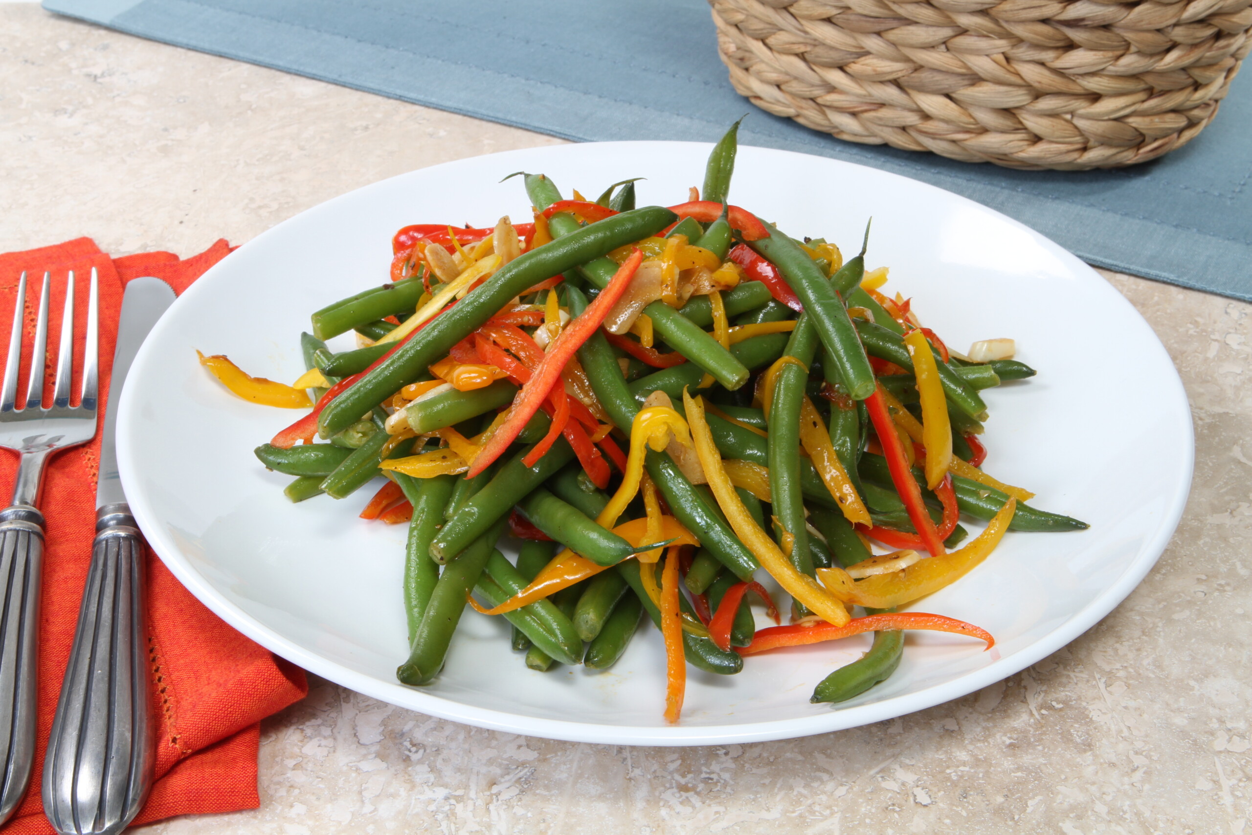 In a large sauté pan, heat the olive oil over medium-high heat. Carefully add the bell pepper, cook for about 1 minute. Add the beans and cook for 3 to 5 minutes. Add the garlic and continue cooking for another minute or until crisp-tender. Add lemon juice and toss before serving.