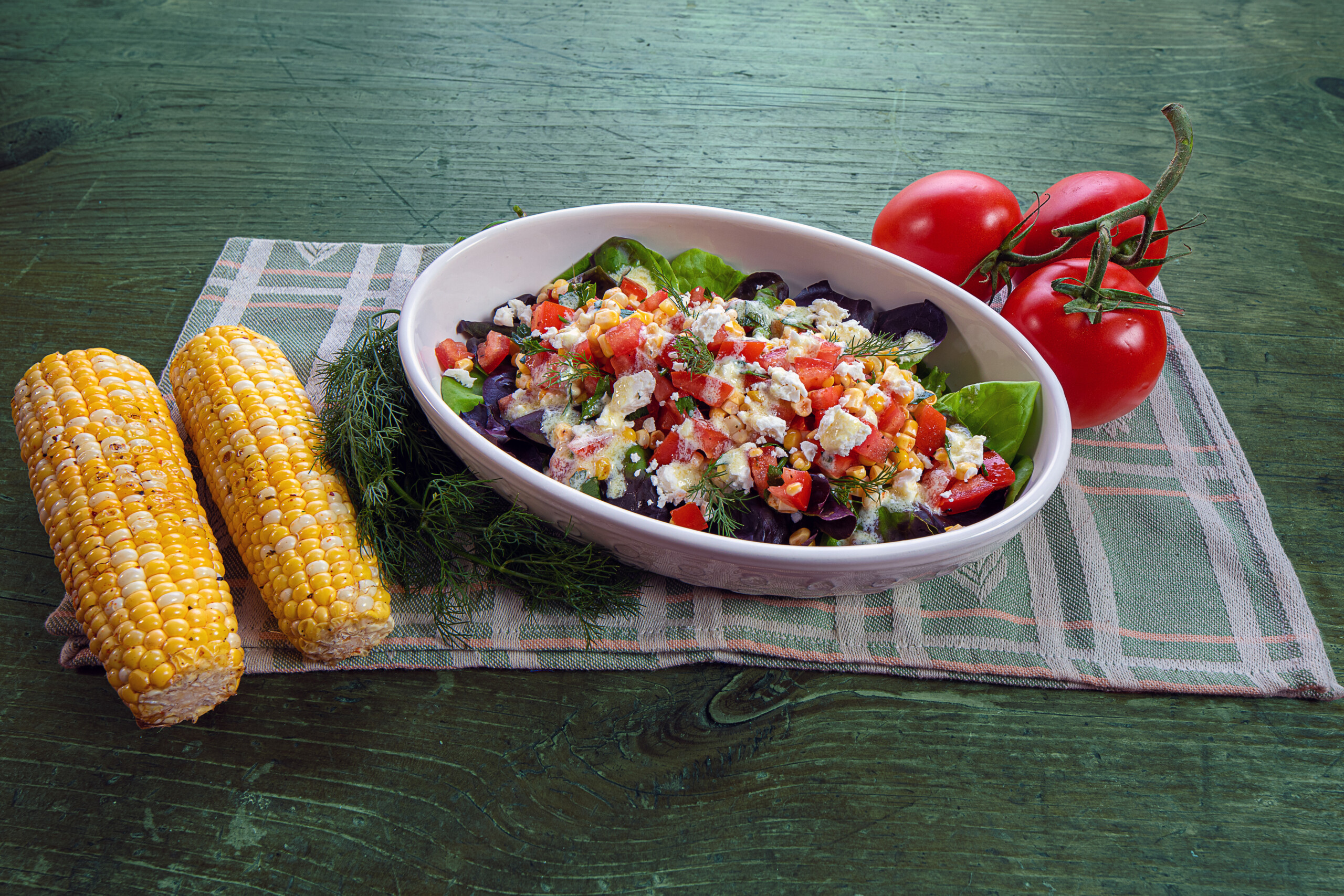To assemble the salad, arrange the leaf lettuces on a chilled medium-sized platter or shallow bowl. Top with the corn kernels and finely diced tomato. Lightly season the entire salad with sea salt and freshly ground black pepper. Garnish with crumbled feta and sprigs of fresh dill.