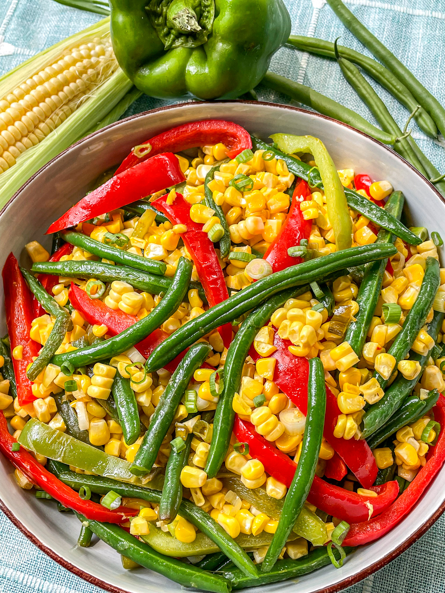 Preheat a large sauté pan over medium heat. Add oil to the preheated sauté pan. Carefully add the trimmed snap beans to the sauté pan. Cook snap beans for 2 to 4 minutes until they start to get some color. Add the corn kernels and sliced bell pepper to the cooking snap beans. Cook ingredients for another 2 to 4 minutes until the ingredients become crisp-tender. Add the seasoning blend and lemon juice. Stir ingredients to combine. Add the green onion and taste. Adjust seasoning with sea salt and pepper. Remove from heat and serve warm as a side dish.